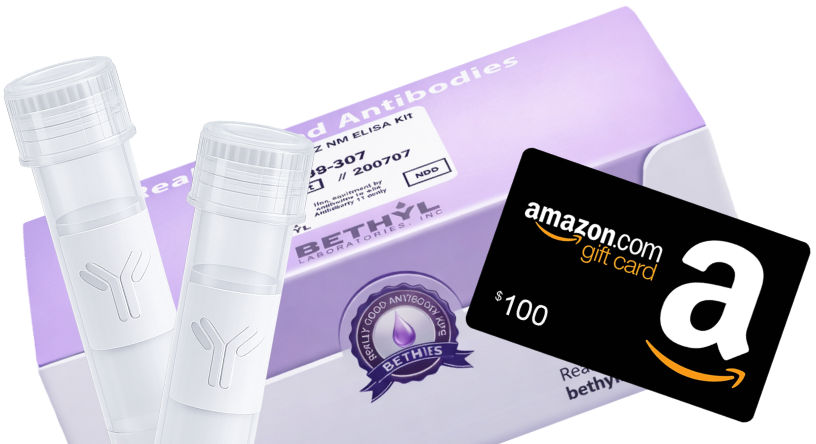 Every eligible submission is entered into a drawing for one of three $100 Amazon gift cards. Submissions that used Bethyl, Abcore, or Arista antibodies receive two drawing entries!